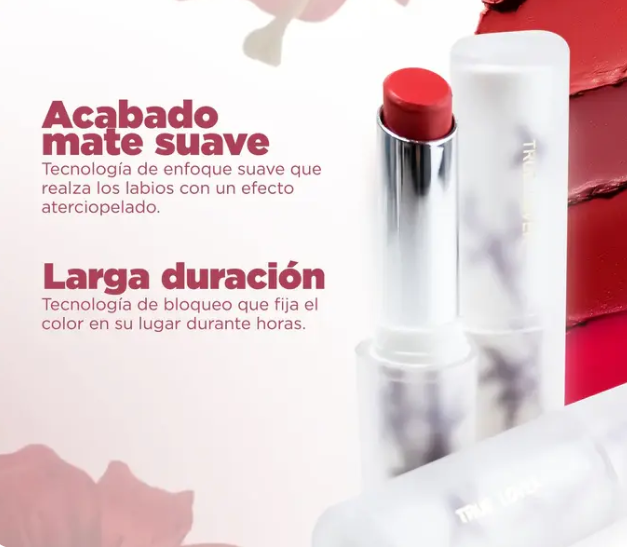 Logra un acabado mate impecable con el Matte Lipstick de True Lover. Este labial, diseñado para ofrecer alta pigmentación en un solo trazo, combina confort, hidratación y tecnología avanzada para unos labios visiblemente suaves, definidos y con un color de larga duración. True Lover Matte Lipstick ofrece una experiencia superior en labiales mate. Experimenta un color intenso y una comodidad excepcional con este labial que redefine el concepto de efecto mate.